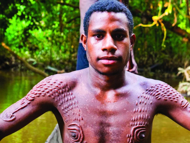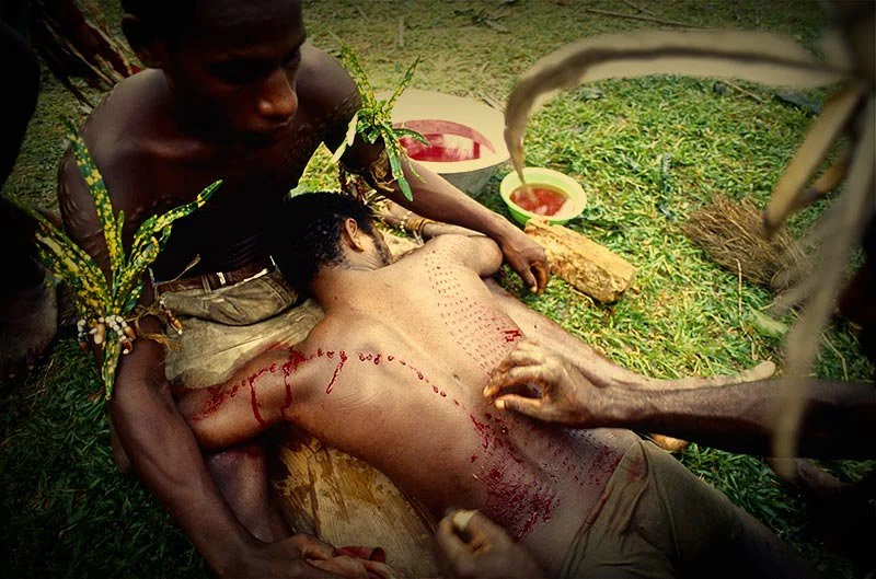 Practised by the Chambri Tribe of Papua New Guinea, Scarification is an ancient initiation tradition for boys entering manhood in which their skin is cut and scarred to represent the scales of a crocodile.