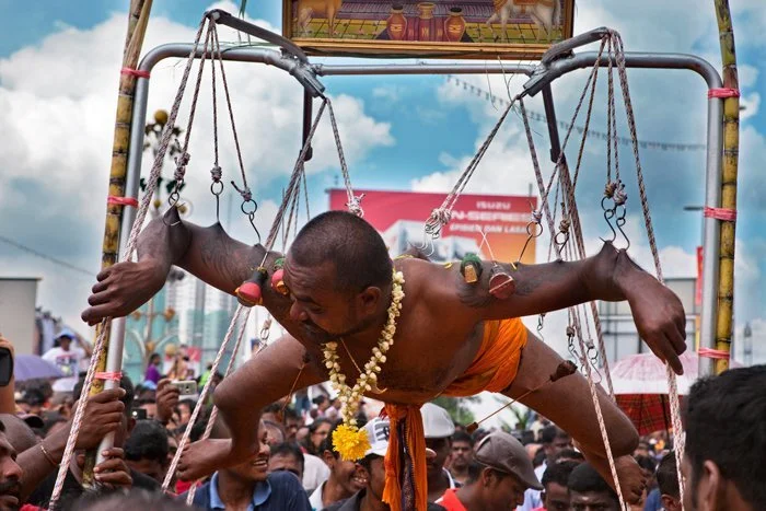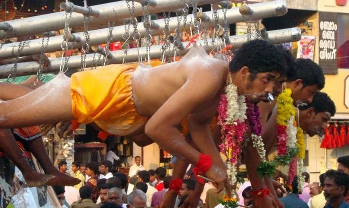 Devotees are hung with metal hooks to the vehicle of Lord Vishnu.